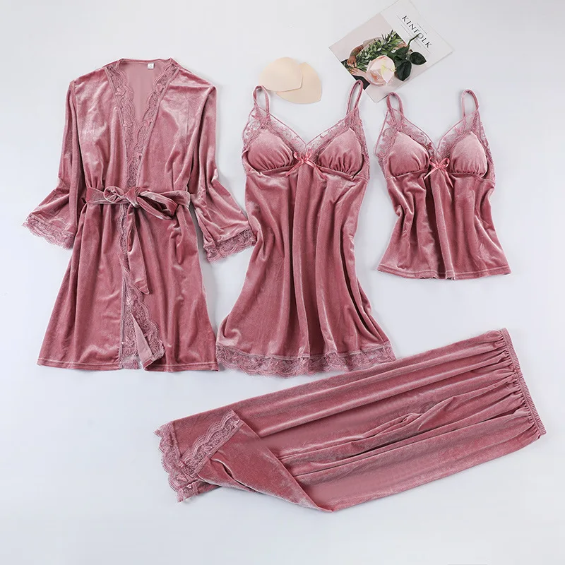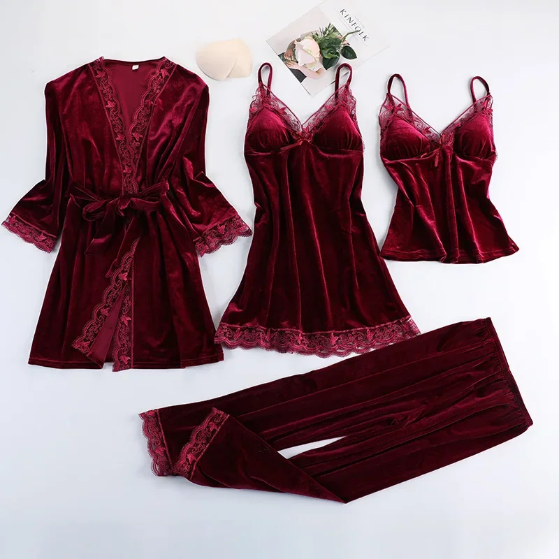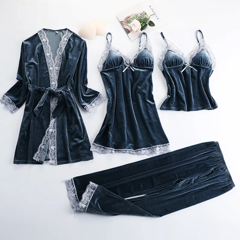 Buy Black Lace Gold Velvet 4 Pieces Women Warm Winter Pajamas Sets With Pants Robe Pajamas Sleepwear Sleeveless Nightwear