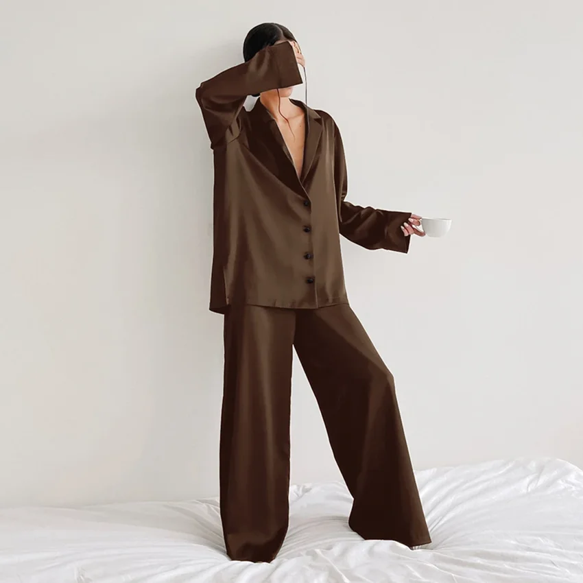 Hiloc Elegant Satin Sleepwear Sexy Low Cut Silk Pajamas For Women Single-Breasted Long Sleeves Wide Leg Pants Trousers Suits