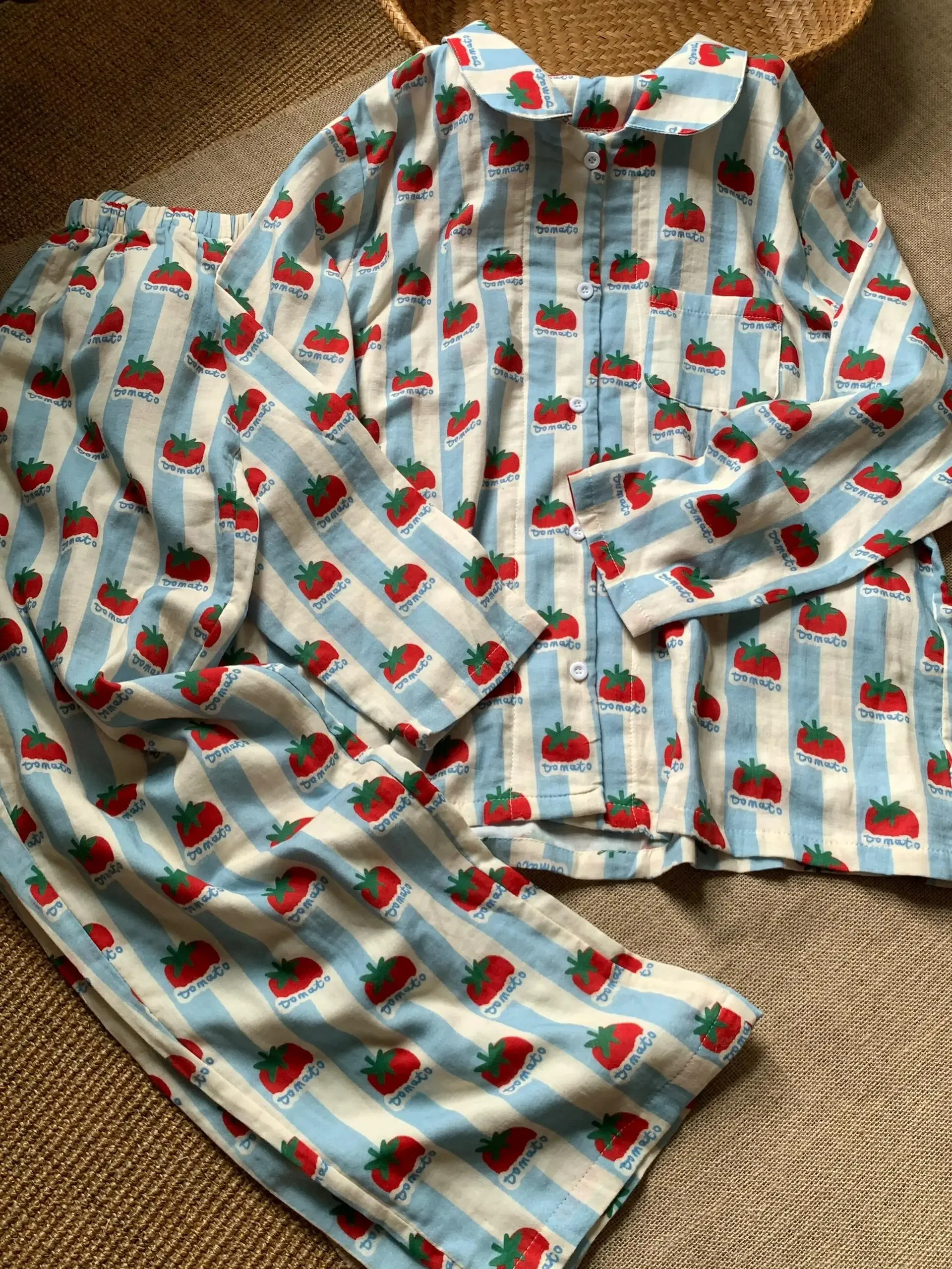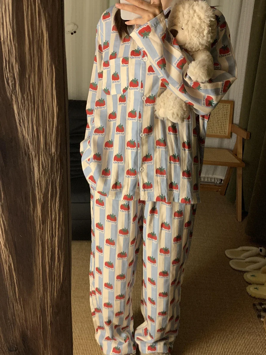 Japanese and Korean fresh style women’s pajamas striped strawberry pattern pure and cute style fashion clothing