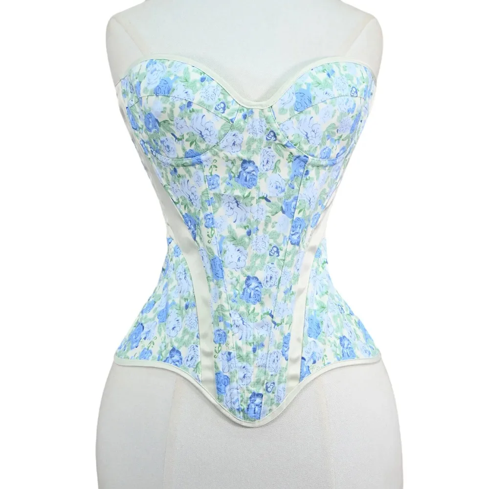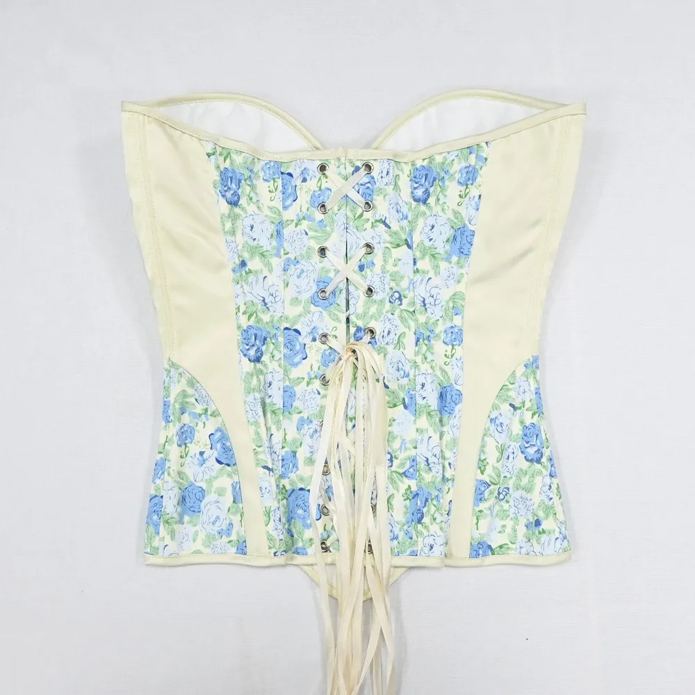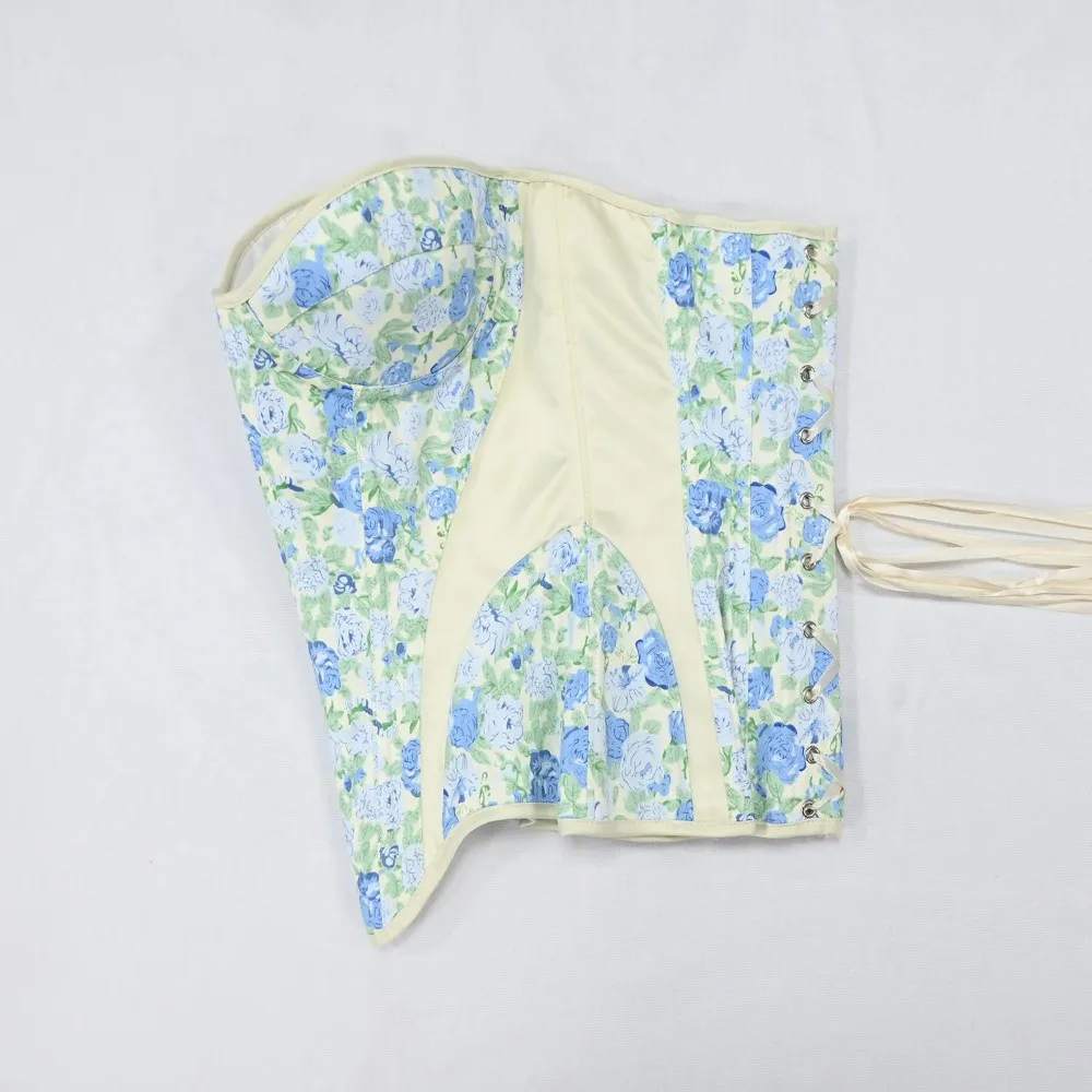 Women Fancy Corset Bustier Overbust With Cups Blue Floral Printed Bodice Lace Up Boned Crops Tube Tops For Wedding Party Costume